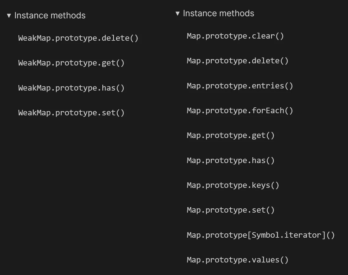 You will find that WeakMap has significantly fewer available methods compared to Map. This is because they fundamentally handle data differently: Map uses strong references, while WeakMap uses weak references.